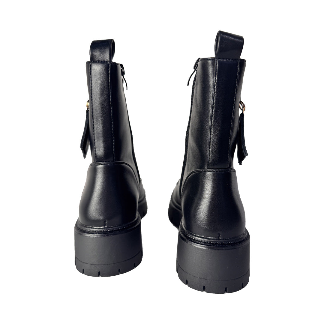 Rinnova il tuo stile con l'anfibio che unisce attitudine grintosa e un tocco glamour inaspettato. Questo anfibio nero, alto alla caviglia, presenta una robusta base carrarmato e una chiusura classica con lacci neri, facilitata dalla pratica zip interna.