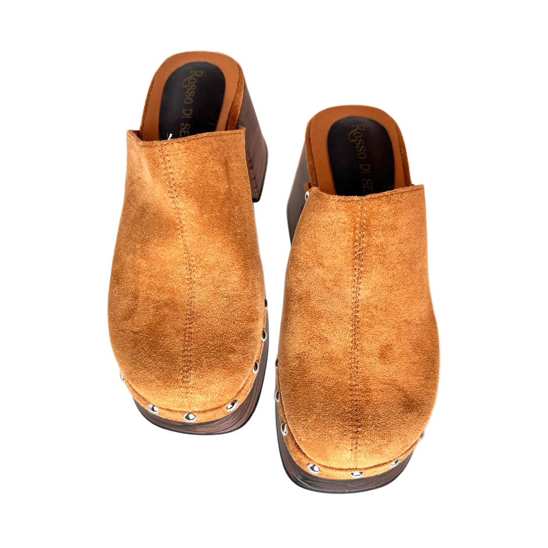 Sabot marrone "Rosso di Sera" in Camoscio e Borchie - Tacco Effetto Legno 7cm