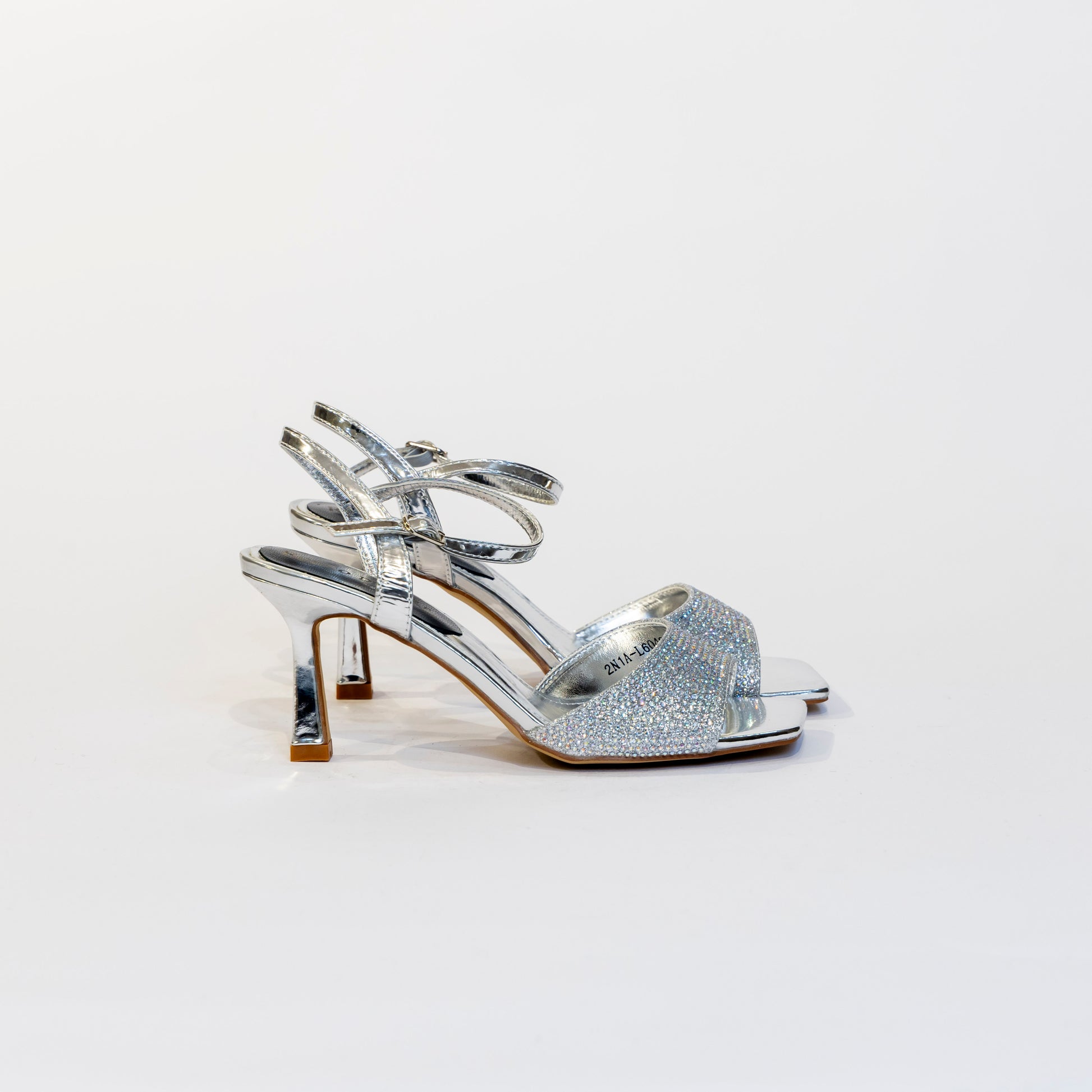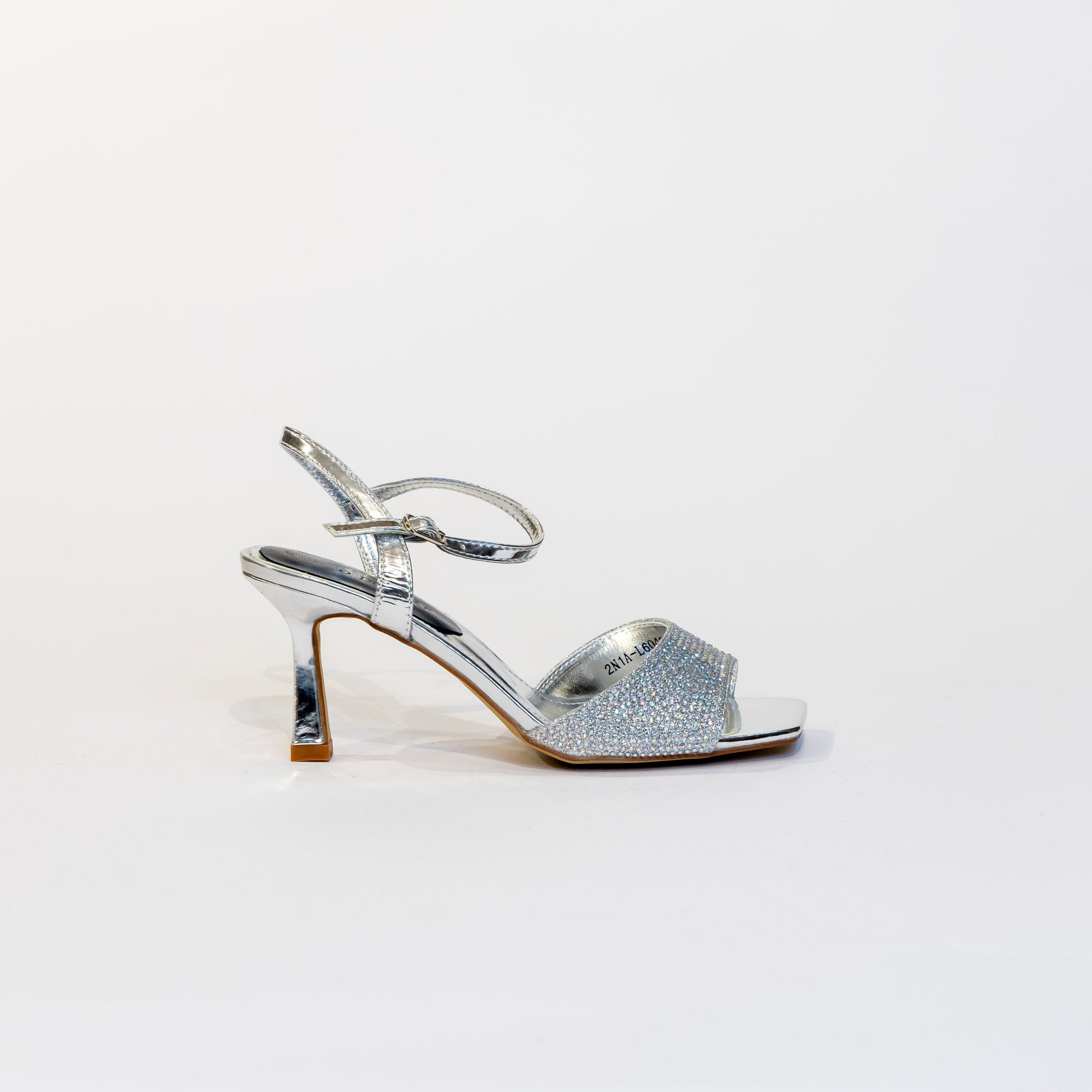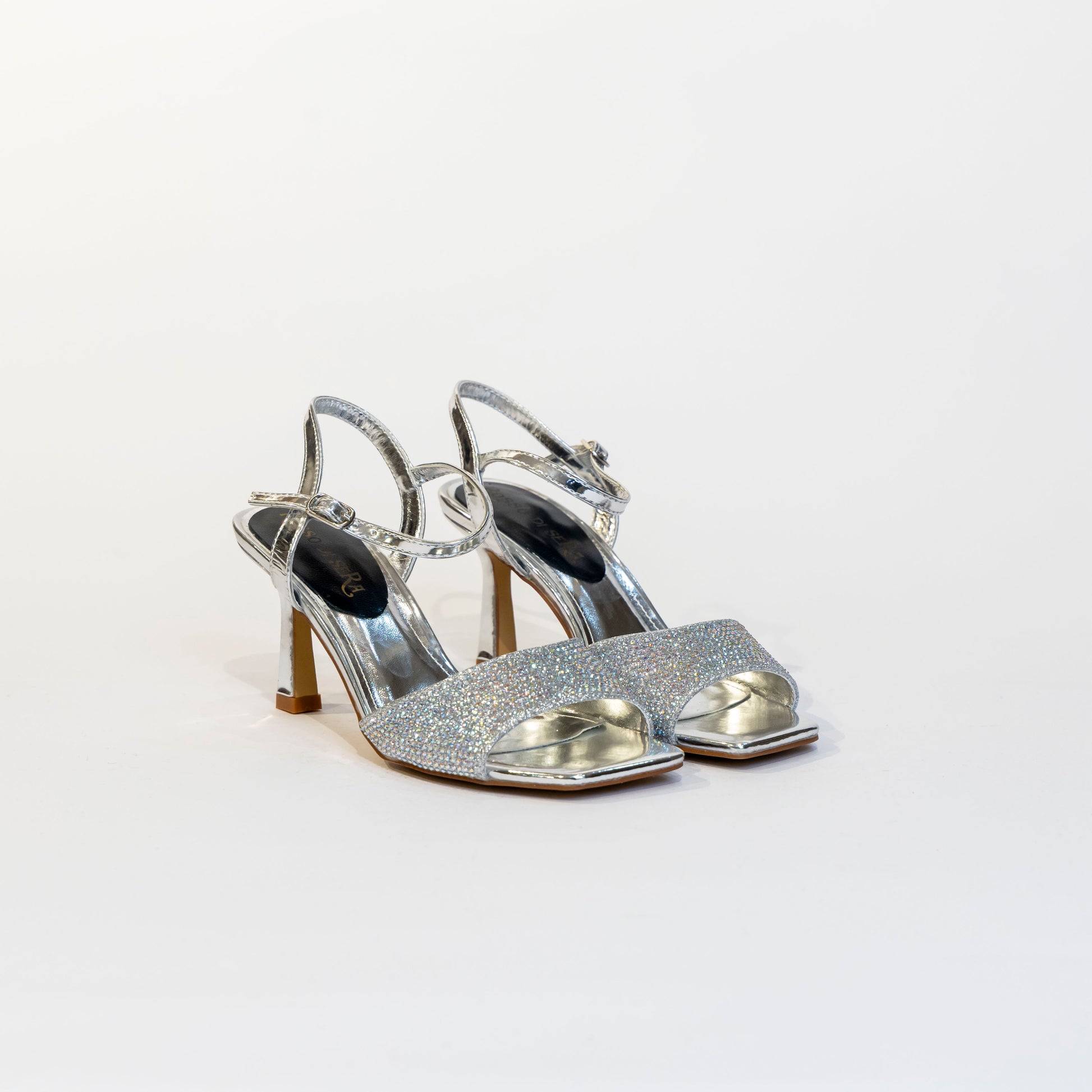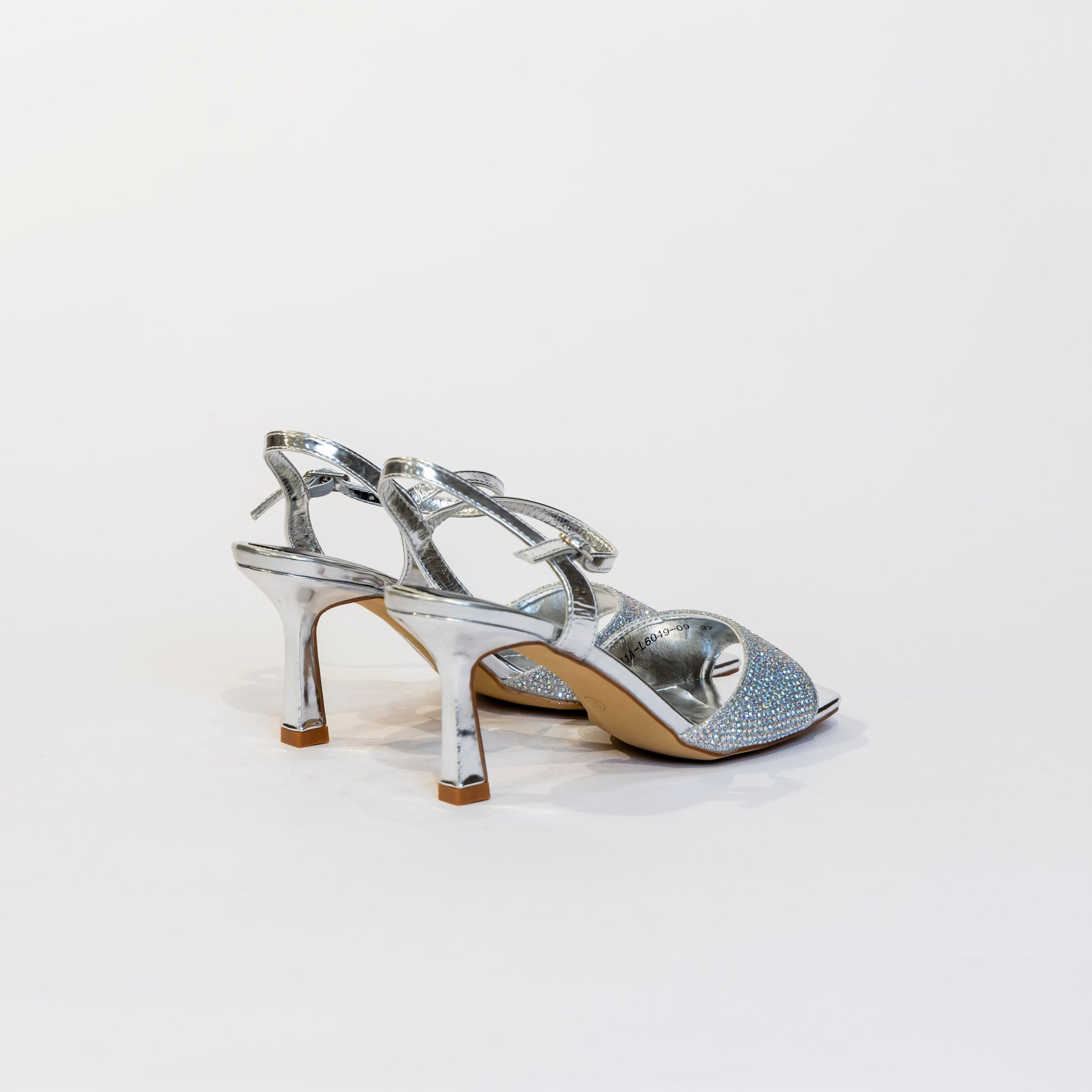 sandalo argento con fascia brillantinata,tacco a rocchetto altezza 80