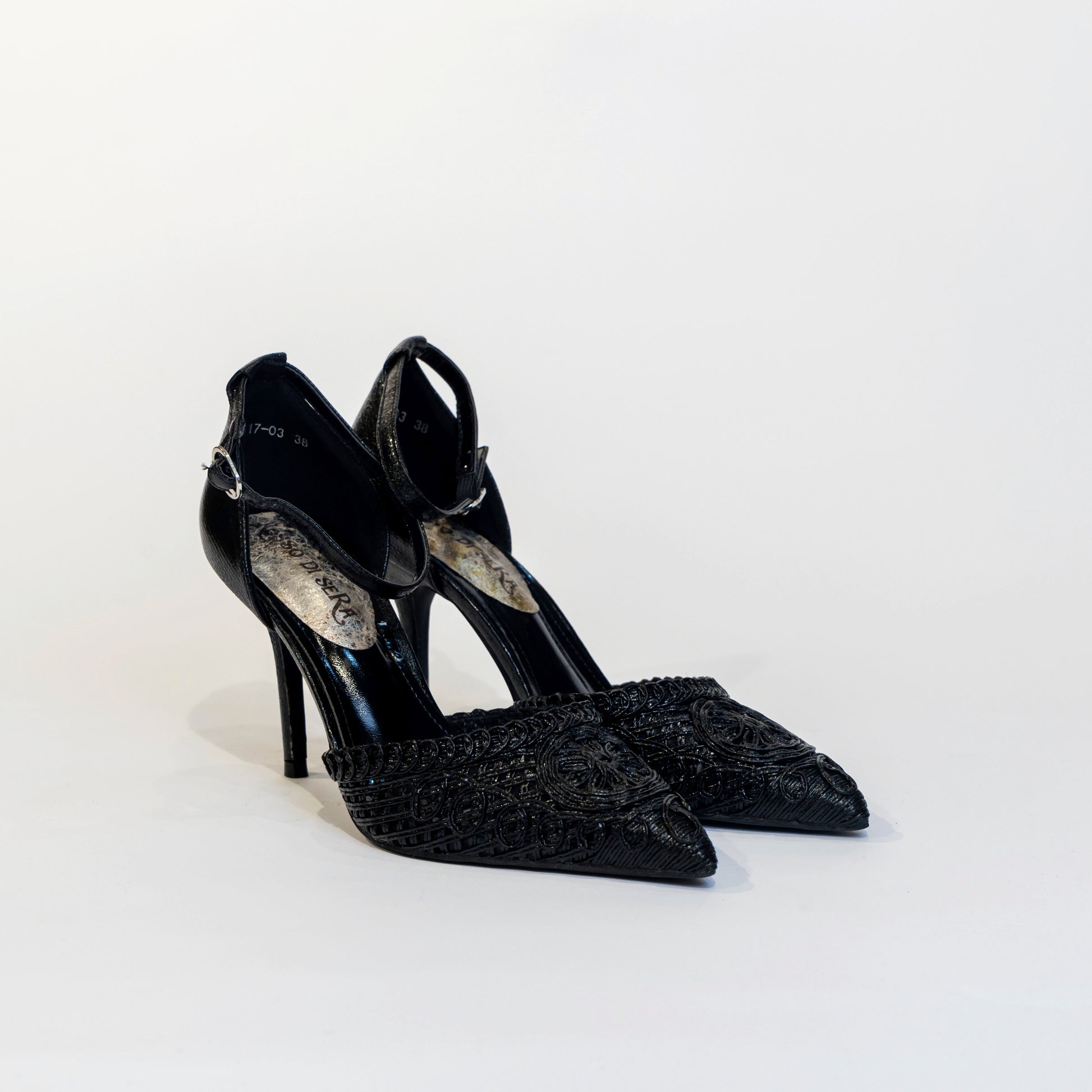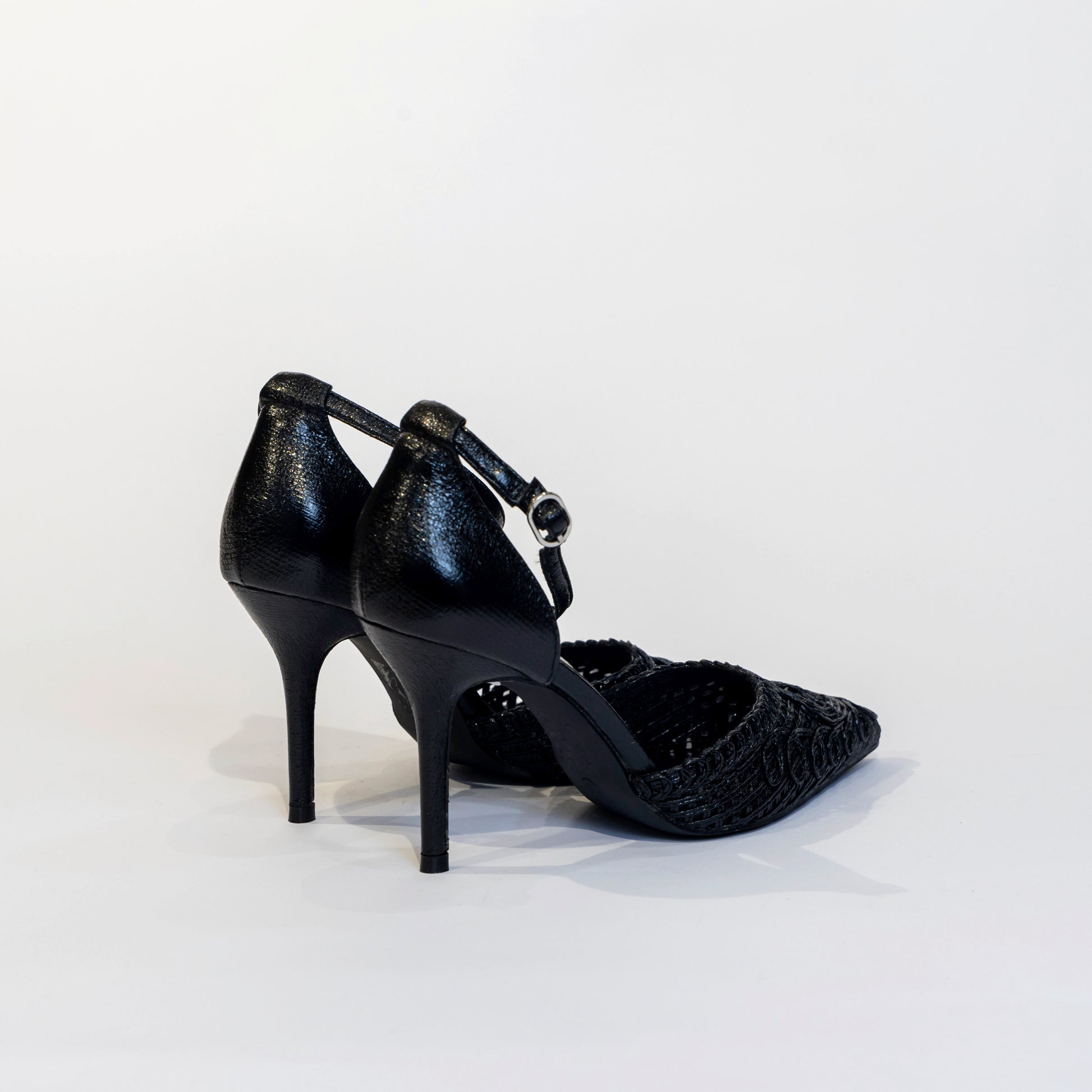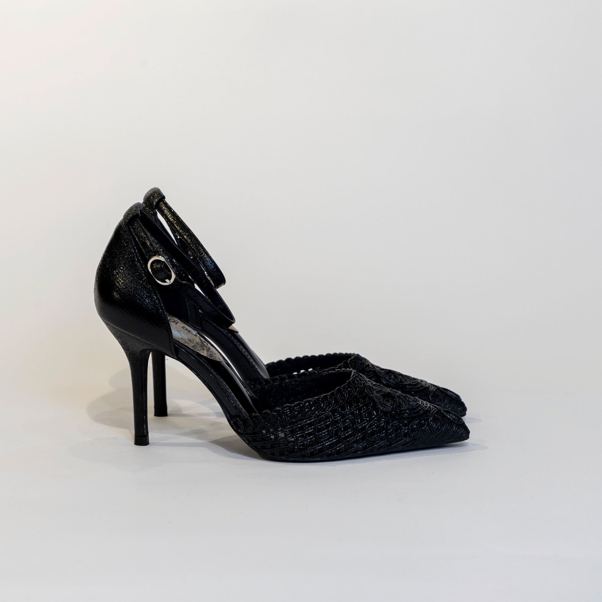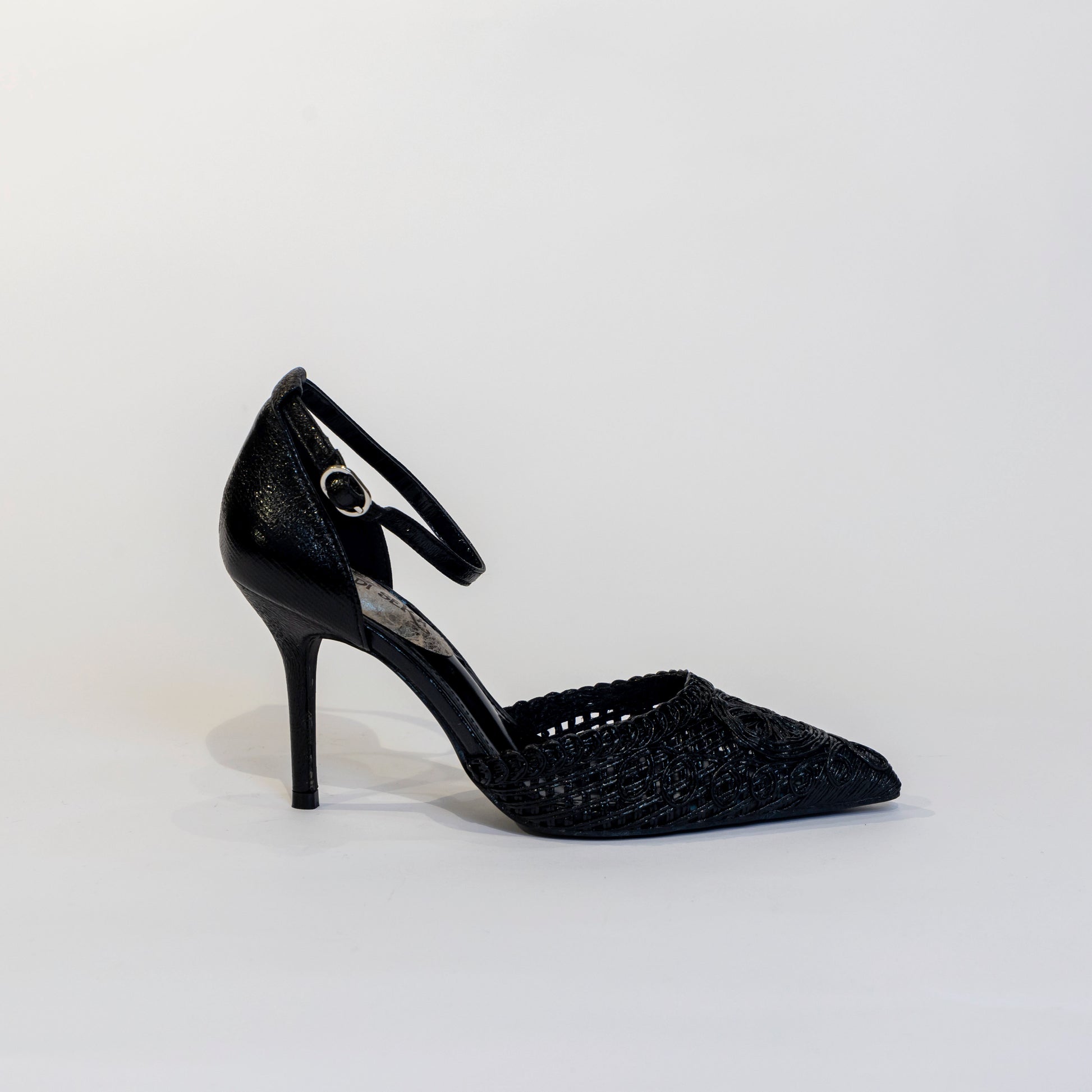 Dècolletè tallonata nera con punta ricamata effetto macramè tacco 100