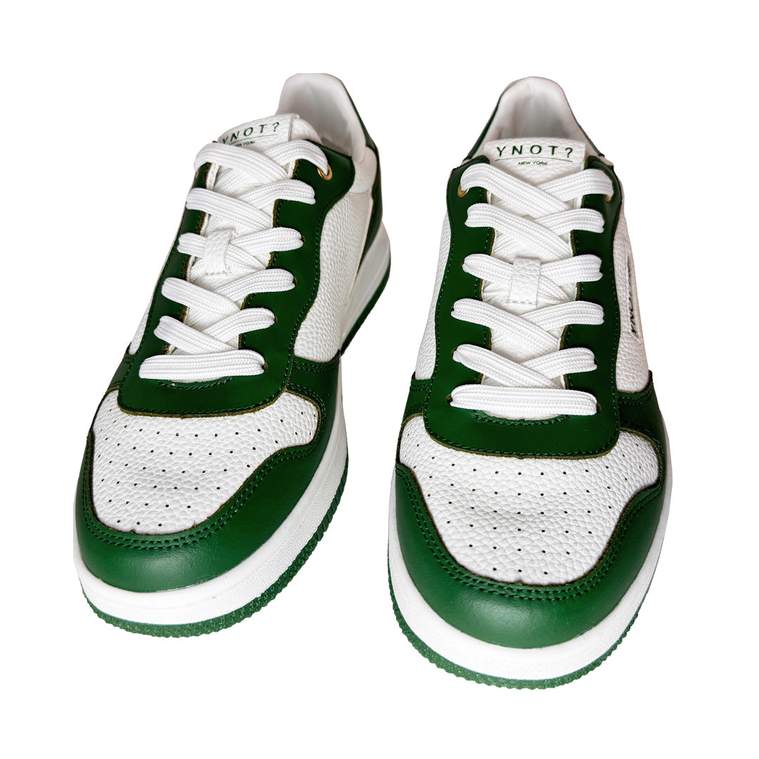 Eleva il tuo stile quotidiano con la nuova sneaker firmata YNOT?. Un perfetto equilibrio tra design contemporaneo e dettagli d'ispirazione vintage. Realizzata in pregiata pelle con effetto martellato, questa calzatura si distingue per il contrasto cromatico tra il bianco ottico e il verde dinamico.