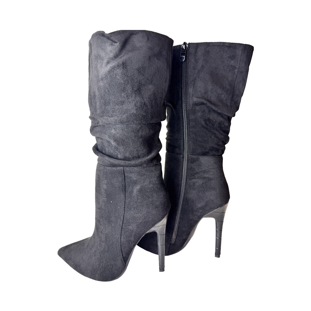Il lussuoso camoscio nero è valorizzato da un morbido drappeggio che veste elegantemente la caviglia. L'elemento distintivo è il tacco: solido, comodo e rifinito con un audace effetto cocco nella stessa tonalità di nero. Facili da indossare grazie alla zip laterale interna.
