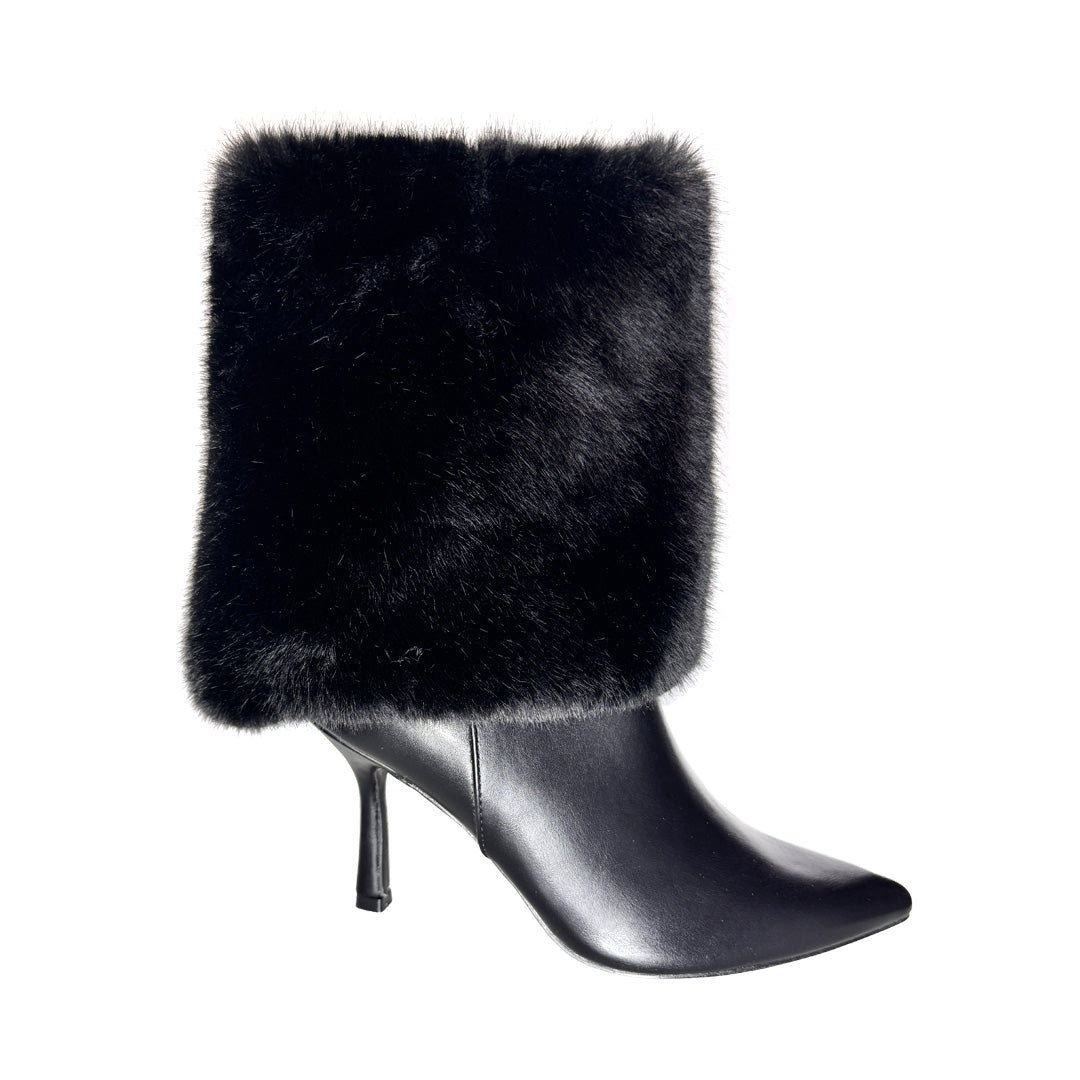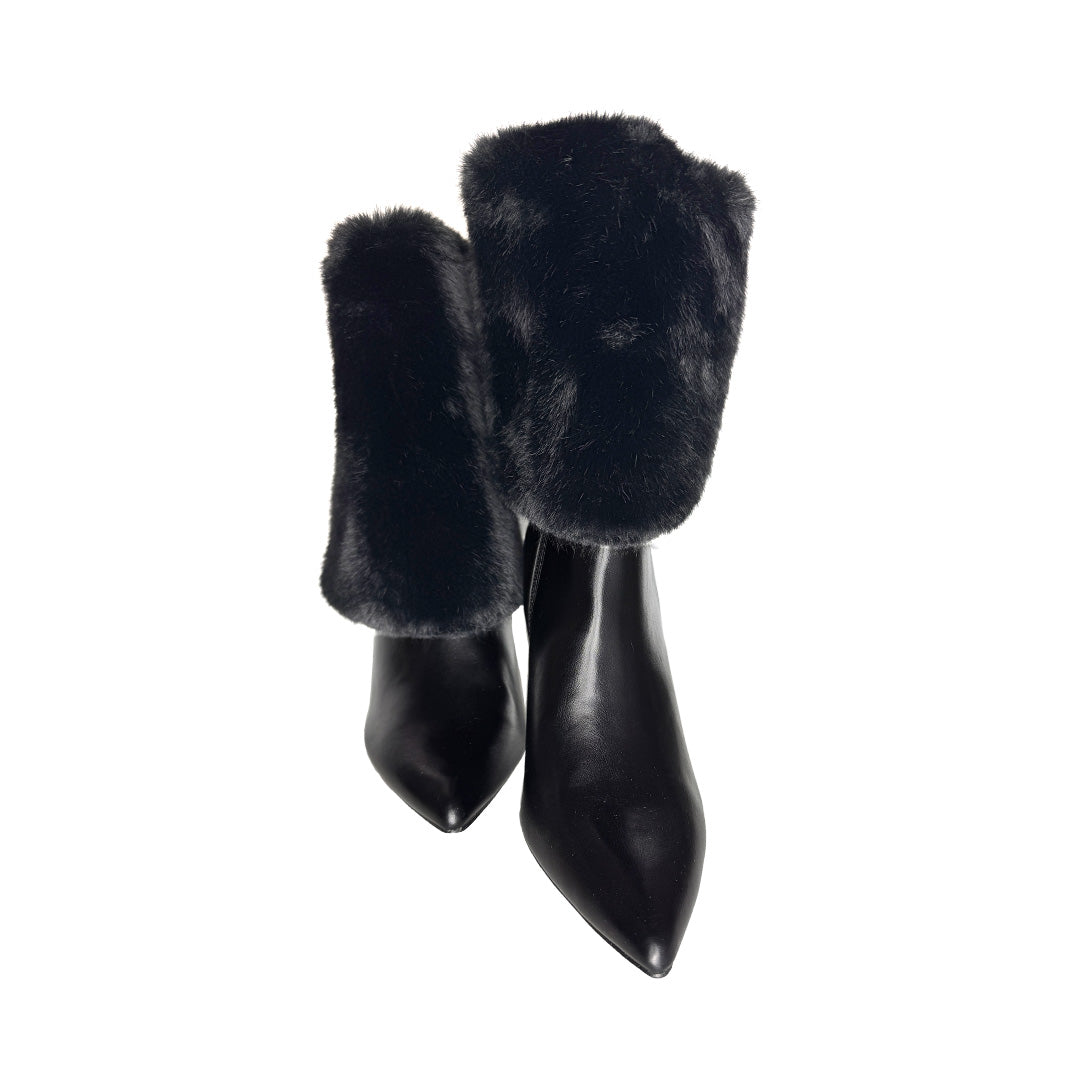Raffinatezza e calore si incontrano nel nuovo tronchetto Rosso di Sera. Questo modello in ecopelle nera si distingue per l'originale effetto calza, che avvolge la caviglia in modo impeccabile, ed è impreziosito da un morbido polsino in pelliccia sintetica che aggiunge un tocco di lusso invernale al design.